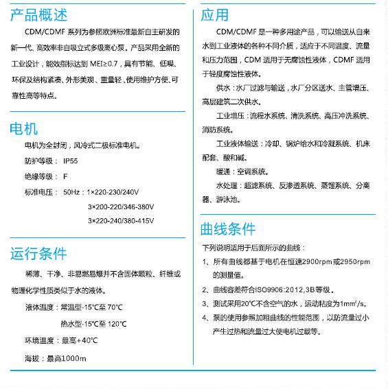 参照欧洲标准自主研发的新一代、高效率非自吸立式多级离心泵。产品采用全新的工业设计,能效指标达到MEI≥0.7,叶轮导叶采用不锈钢板冲压焊接或不锈钢精密铸造制成,电机为全封闭,风冷式二极标准电机。